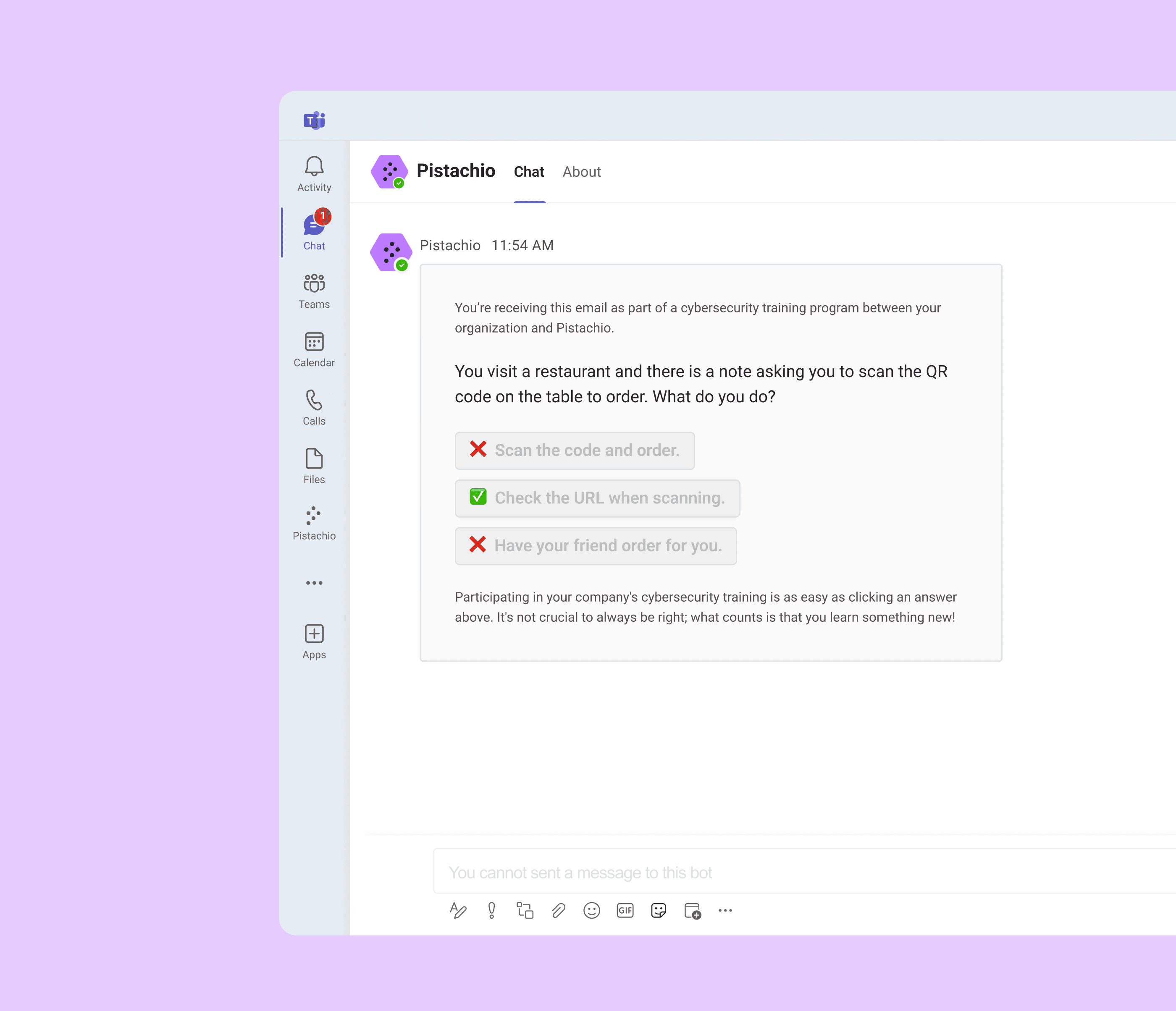 You can now easily update your preferences to receive training scenarios directly in your Teams or Slack app, right alongside your daily conversations. By default, Pistachio sends training scenarios to your Outlook inbox. But once permissions are granted, responding to a scenario will take you to a page where you can choose your preferred app. After you make your selection, future scenarios will automatically be delivered there. Switching between apps won’t affect your training history. Your progress stays with you, no matter which platform you use.